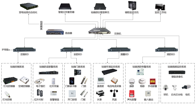 變電站智能輔助系統主要由輔助監控主機、站端綜合管理單元、站端工作站、交換機、智能門禁、視頻監控、防盜報警、消防報警、環境監測、燈光控制等子系統以及信息傳輸通道等設備及管理平臺組成。